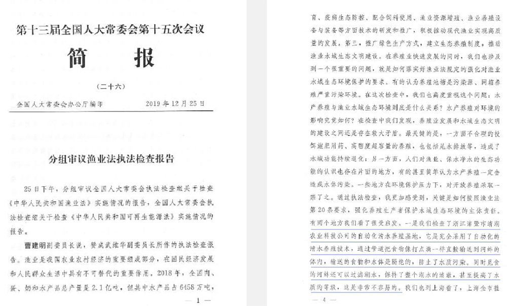 2019年9月25日,全國(guó)人大常委副委員長(zhǎng)曹建明帶隊(duì)考察公司。 2019年底,曹委員長(zhǎng)在第十三屆全國(guó)人大常委會(huì)第十五次會(huì)議上點(diǎn)名表?yè)P(yáng)公司模式。 “有兩個(gè)地方我們看來(lái)很受啟發(fā)。一是我們檢查了浙江諸暨市清湖農(nóng)業(yè)科技公司的自動(dòng)化清水養(yǎng)殖基地,它是完全采用了自動(dòng)化的清水養(yǎng)殖技術(shù),通過(guò)管道把食物像打點(diǎn)滴一樣直接輸送到河鮮的體內(nèi),輸送的食物和水體是隔絕的,防止了水質(zhì)污染。同時(shí)覓食的河蚌還可以過(guò)濾湖水,保持了整個(gè)湖水的清澈,甚至提高了水質(zhì)的登記,這是非常不容易的”