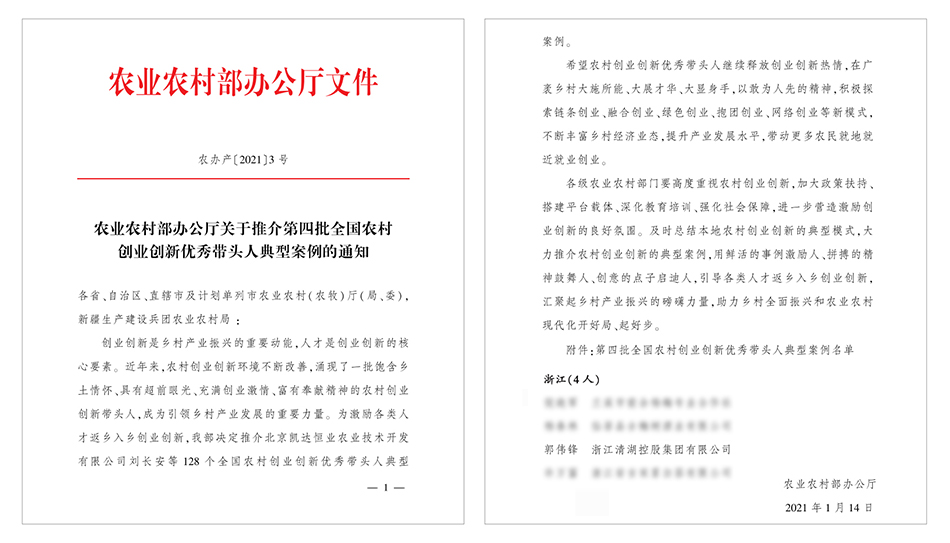 ? ? ? 2021年1月14日,農業農村部發文(農辦產【2021】3號)公布了第四批全國農村創業創親優秀帶頭人典型案例名單,浙江清湖控股集團有限公司董事長郭偉鋒上榜。